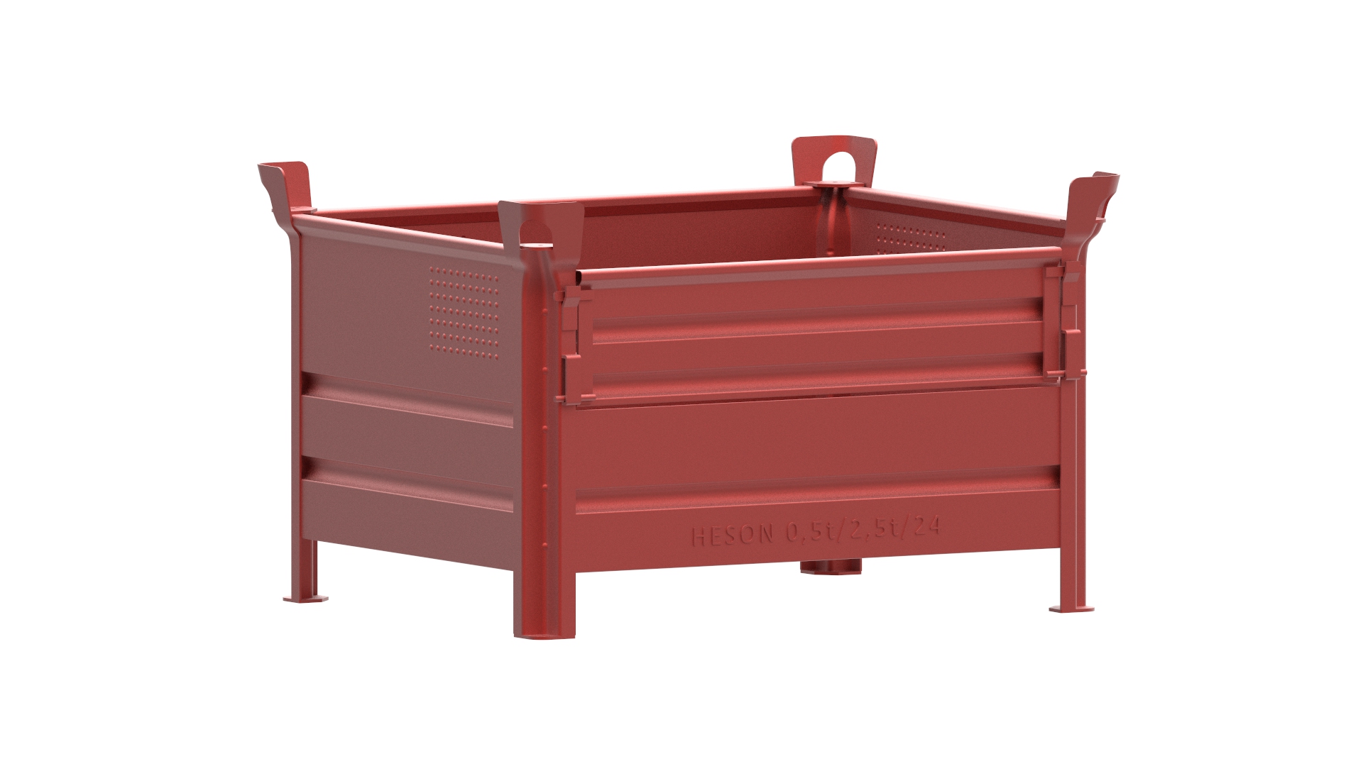 Der hohe flexible Einsatzbereich in der neuen patentrechtlich geschützten W-Pfosten-Ausführung mit angekanteter Stütze. Der stabile, rohrähnliche Wandumschlag oben, die stabilen Rundsicken im Wand- und Bodenbereich sowie das genoppte Labelfeld für die Frachtaufkleber, die sich von den Noppen leichter entfernen lassen, sind markante Merkmale der HESON-Triade.