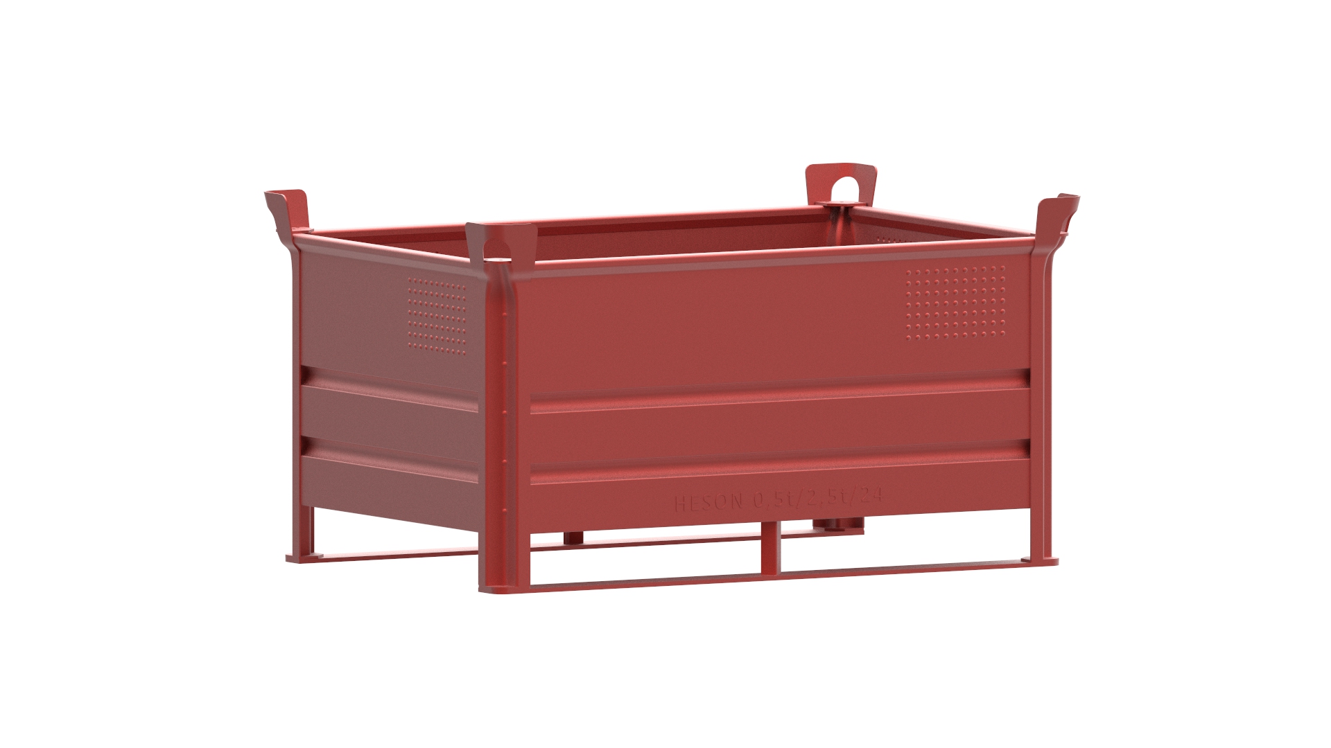Der hohe flexible Einsatzbereich in der neuen patentrechtlich geschützten W-Pfosten-Ausführung mit angekanteter Stütze. Der stabile, rohrähnliche Wandumschlag oben, die stabilen Rundsicken im Wand- und Bodenbereich sowie das genoppte Labelfeld für die Frachtaufkleber, die sich von den Noppen leichter entfernen lassen, sind markante Merkmale der HESON-Triade.